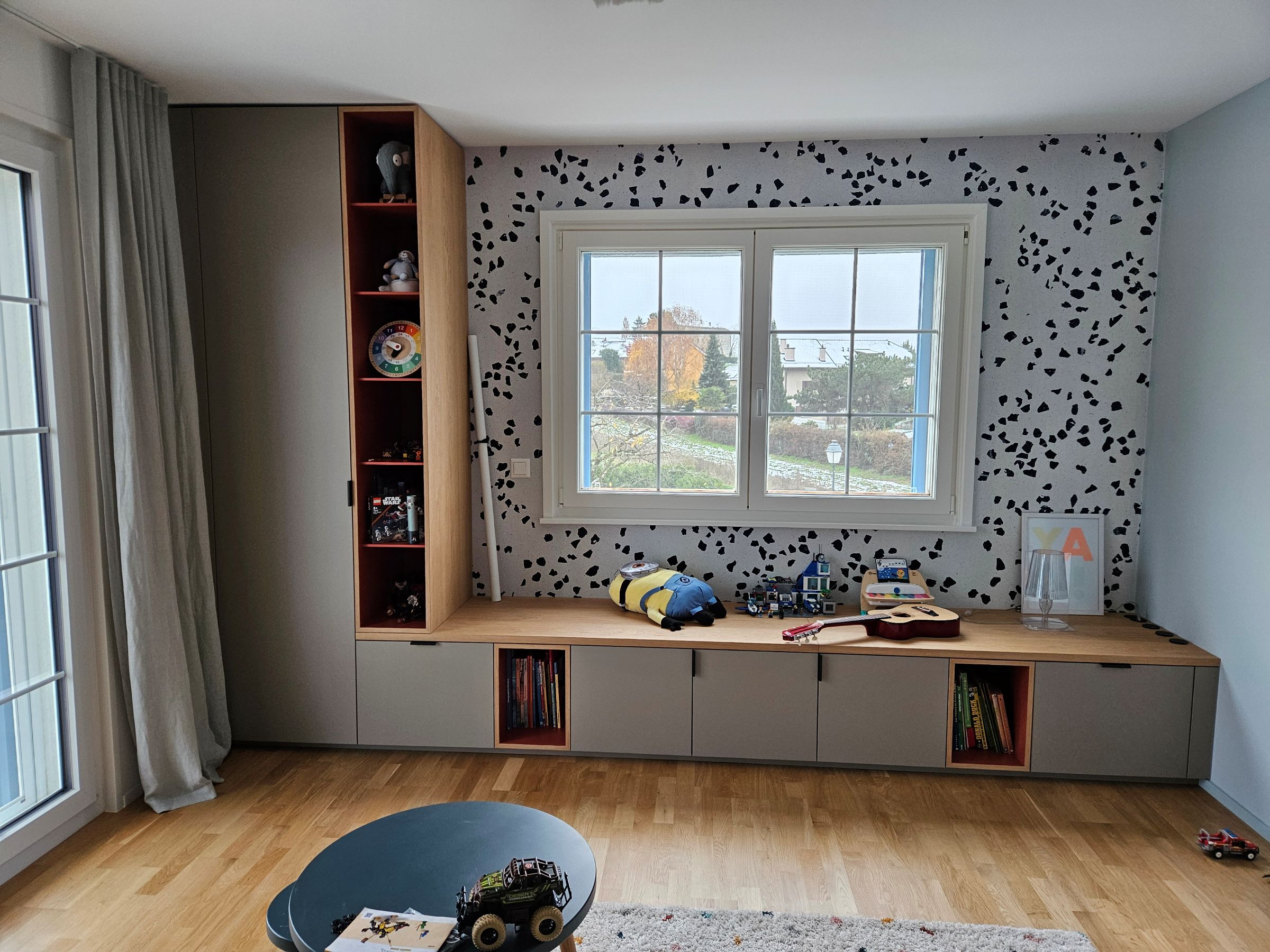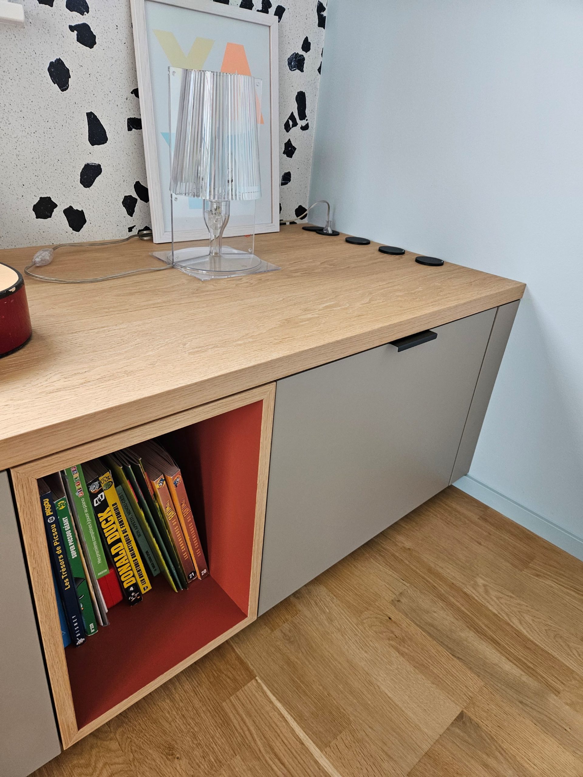 Pensé pour optimiser l’espace tout en offrant une atmosphère à la fois ludique et élégante, cet agencement sur mesure transforme la salle de jeux en un lieu polyvalent, parfaitement organisé et résolument contemporain. Réalisé en collaboration avec Onoff Architecture d’Intérieur, l’ensemble conjugue lignes épurées, matériaux chaleureux et détails fonctionnels.