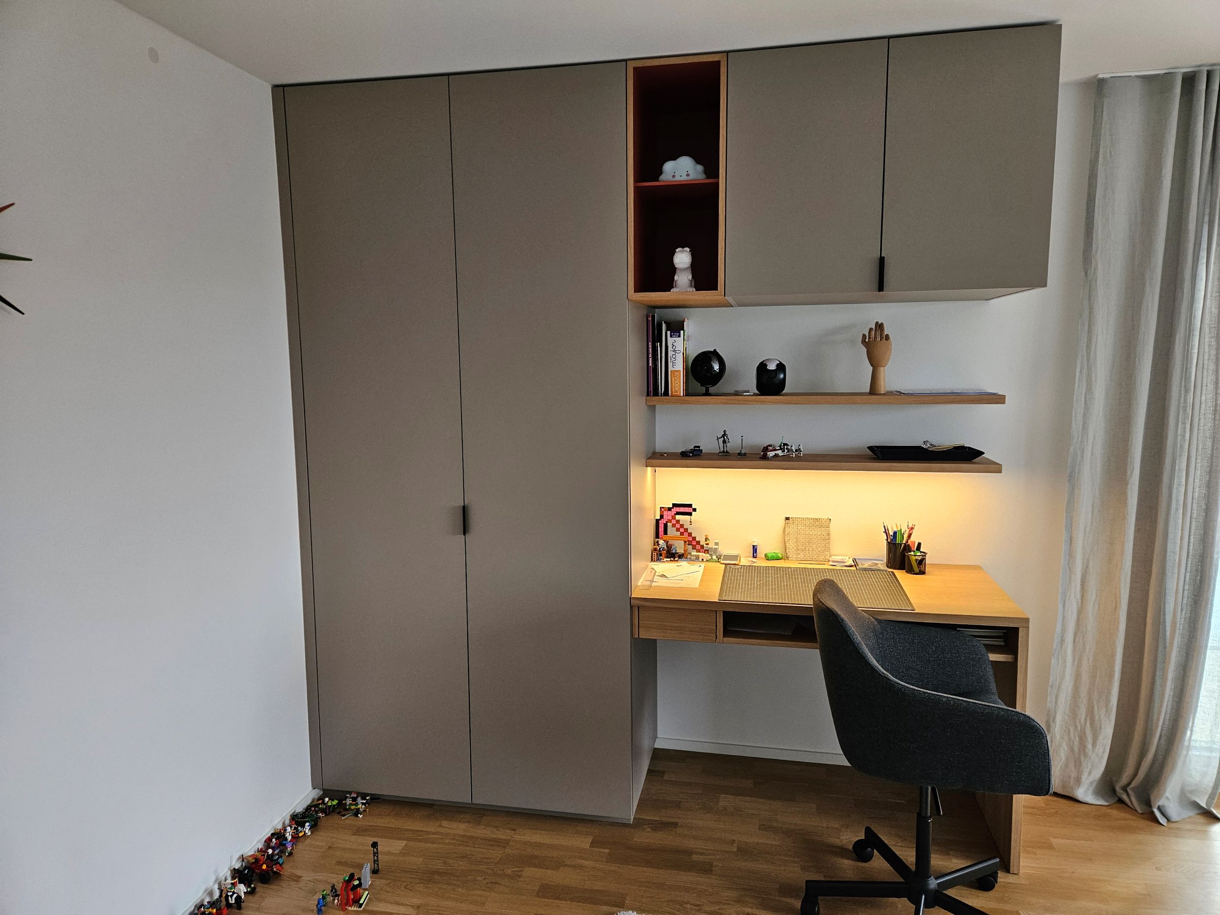 Sur un autre pan de mur se déploie une seconde structure comprenant une armoire de rangement, un bureau en chêne massif, des tablettes ouvertes au-dessus ainsi qu’un meuble haut avec niche et une armoire de rangement sur la gauche. Cette configuration crée à la fois un espace de travail confortable et de multiples zones de rangement.