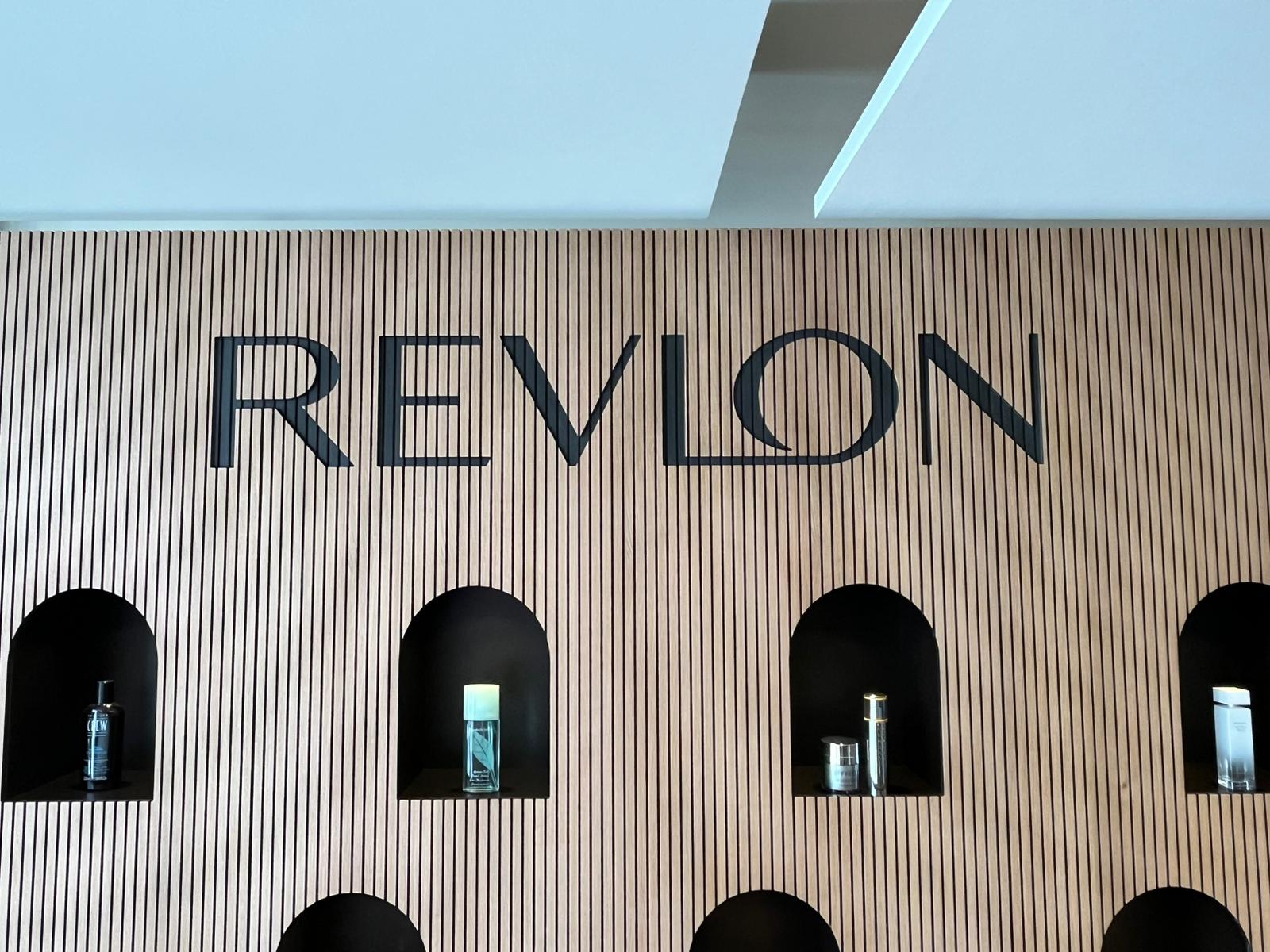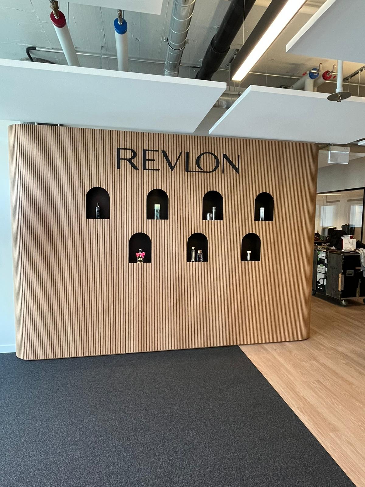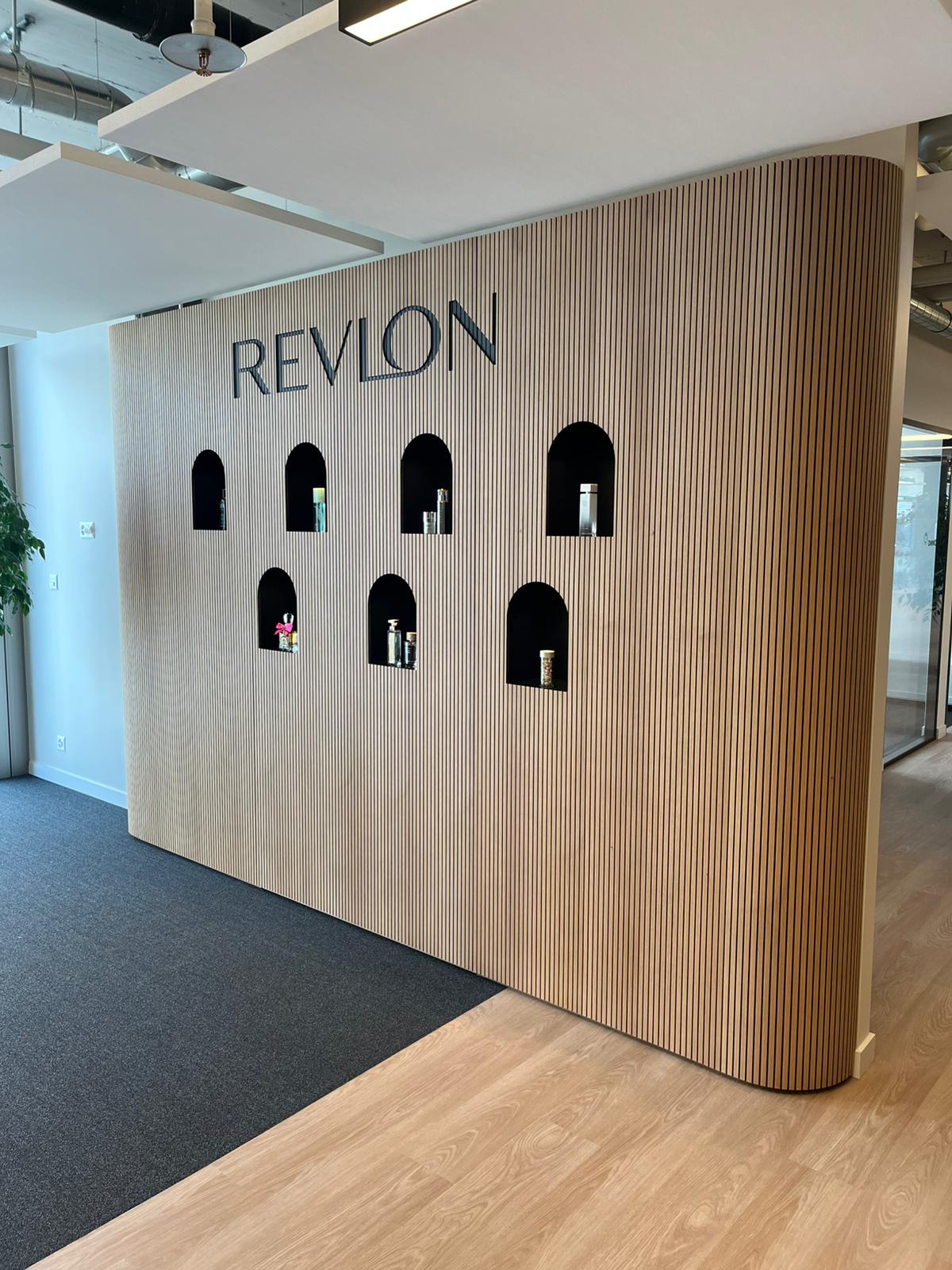 La façade est réalisée en chêne naturel vernis mat, avec un striage vertical qui renforce l’effet de texture et de profondeur. L’intérieur des niches et le logo sont exécutés en noir mat, créant un contraste raffiné. Le logo Revlon, entièrement usiné dans l’épaisseur de la boiserie, affirme l’identité de la marque avec subtilité et précision.