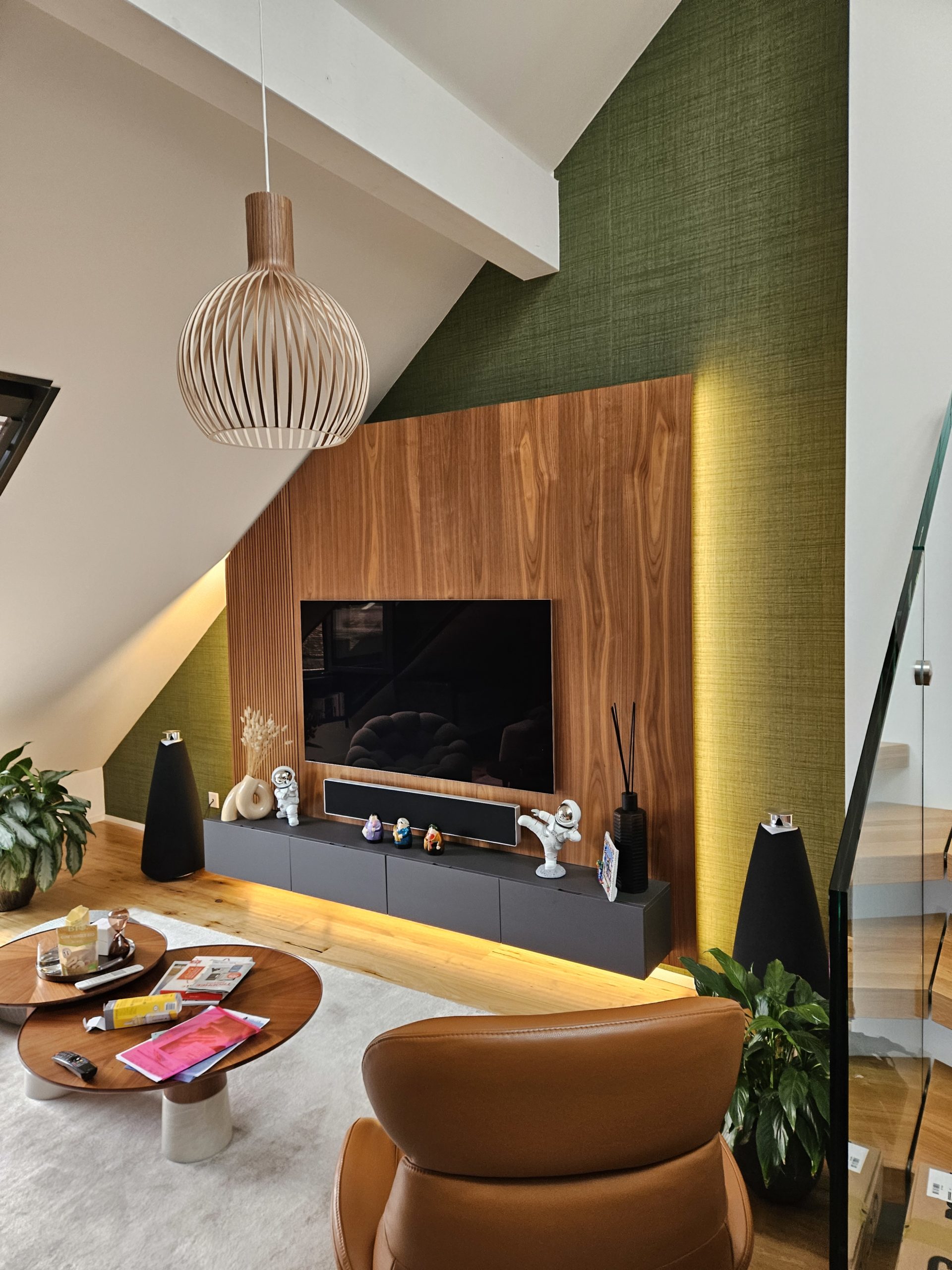Dans cet espace mansardé, nous avons conçu et réalisé un meuble TV suspendu sur-mesure, parfaitement intégré sous la pente et épousant le biais du mur. Ce projet illustre notre maîtrise des aménagements dans des volumes atypiques, où précision et créativité sont indispensables.