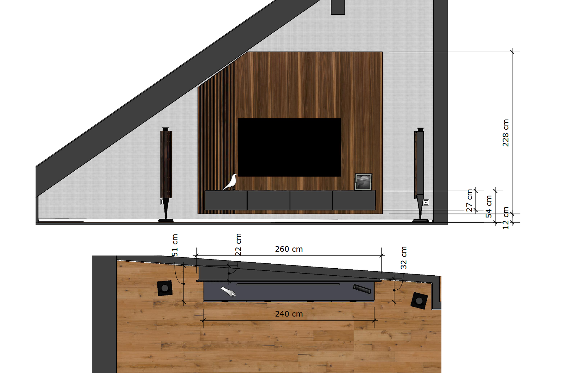 Meuble TV suspendu sur-mesure sous pente
