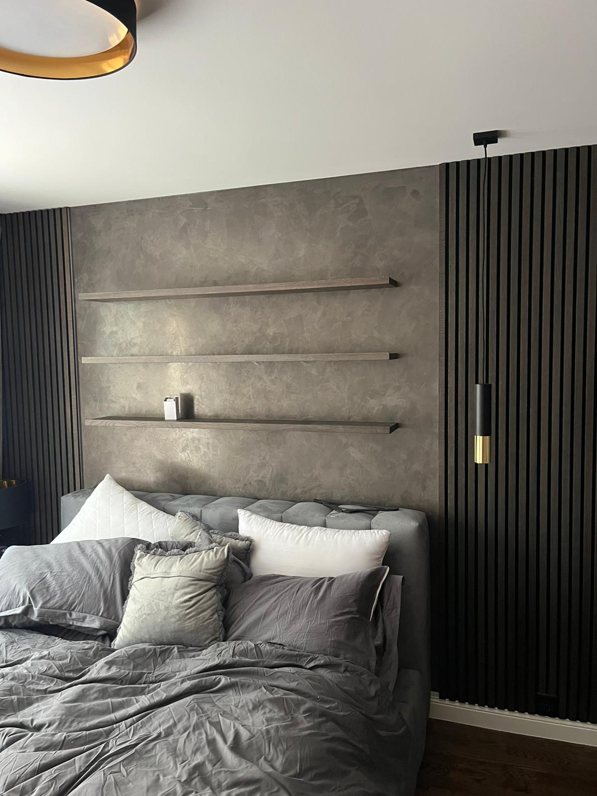 Réalisation d’une tête de lit sur mesure, pensée comme un véritable élément architectural et décoratif, alliant esthétique contemporaine et richesse des matériaux.