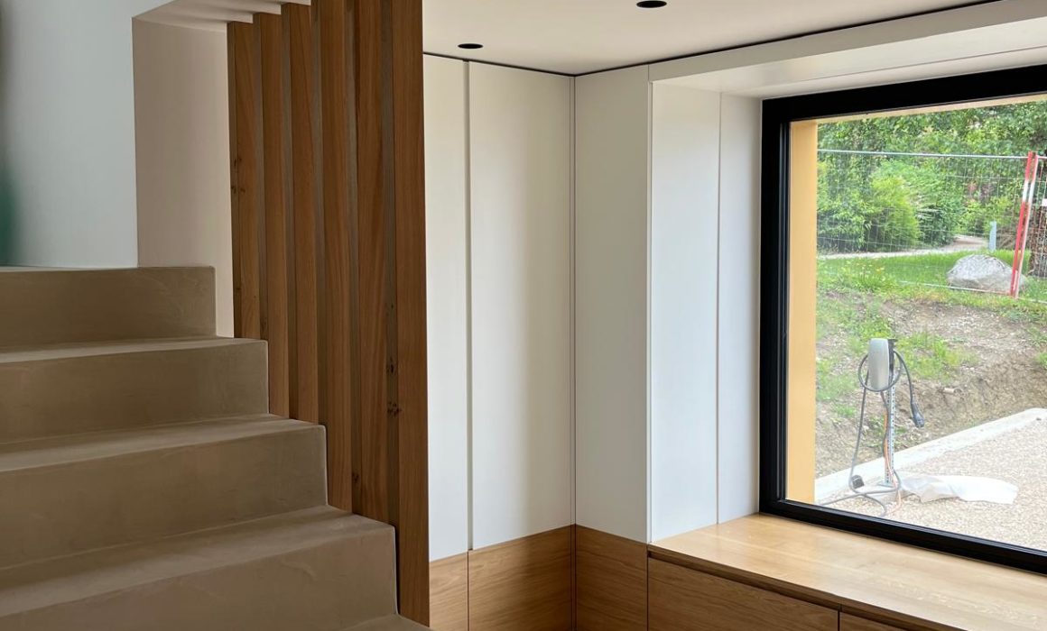 Les intérieurs de meubles sont réalisés en mélaminé gris clair pour un contraste lumineux et fonctionnel. Les plans de travail et la crédence en marbre de Carrare apportent une touche minérale et intemporelle, en résonance avec le caractère ancien de l’appartement. L’ensemble de cet agencement a été conçu et fabriqué dans notre atelier, avec une attention particulière portée à la précision des détails et à la qualité des mécanismes, notamment grâce au système de portes escamotables Hawa Folding Concepta III.