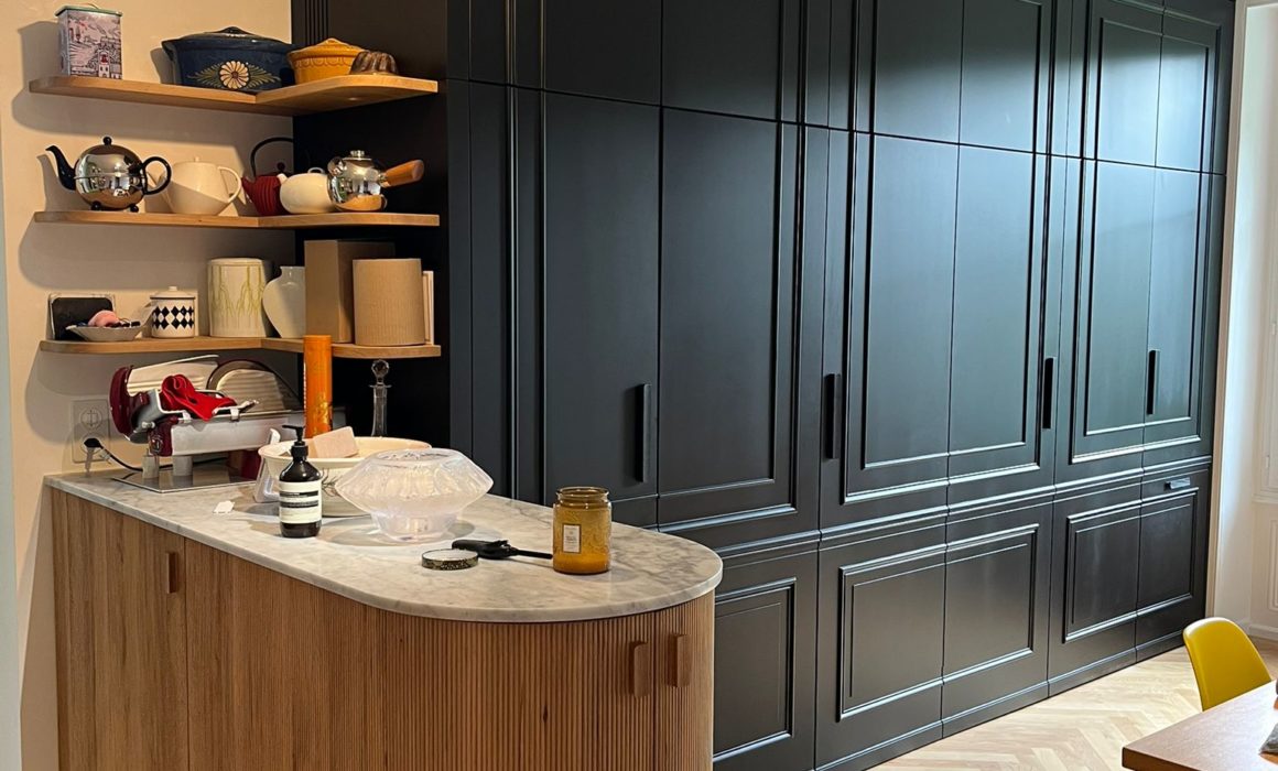 Réalisée dans le cadre de la rénovation complète d’un bel appartement ancien de plain-pied, cette cuisine sur mesure a été pensée pour s’intégrer avec élégance au style et au caractère de l’immeuble existant. Le dessin de l’agencement revisite les codes classiques à travers des façades moulurées associées à des panneaux laqués noir, offrant un équilibre subtil entre tradition et modernité.